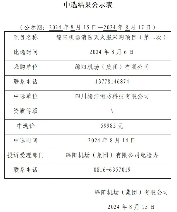 綿陽機(jī)場消防滅火服采購項(xiàng)目(第二次)中選結(jié)果公示表